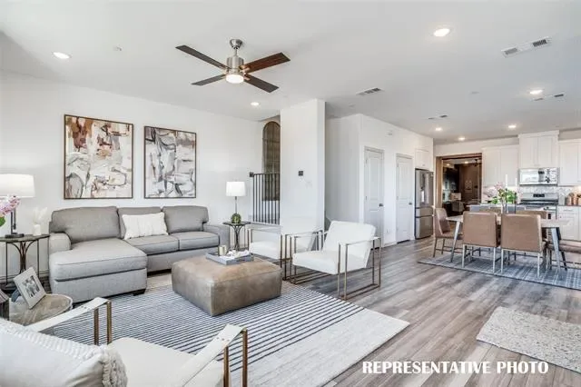 CB JENI HOMES DALTON II floor plan. This luxurious 3-bedroom, 2.5-bathroom townhome offers modern living with a spacious layout and thoughtful design. The open-concept family room is perfect for entertaining. The gourmet kitchen is a chef’s dream, boasting custom cabinetry, sleek stainless steel appliances, elegant countertops, and a stylish designer backsplash. Upstairs, a versatile game room separates the owner’s suite from two comfortable secondary bedrooms, ideal for movie lovers, sports fans, or gamers. The impressive owner’s suite features a spa-like shower and a massive walk-in closet. This new construction home delivers luxury and comfort while offering a low-maintenance lifestyle. Ideally located moments from the community pool, and planned restaurants and shops! Ready to call home in July 2026.