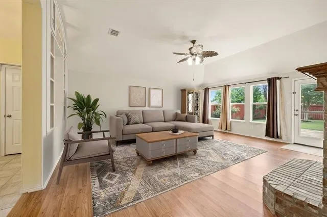 Situated on a premium corner lot backing to tranquil greenspace, this impeccably maintained single-story home is the definition of move-in ready, inviting, and ready for you to start your next chapter. From the moment you arrive, the charming front porch and lush, manicured landscaping create a warm welcome and undeniable curb appeal. Step inside to a light-filled and spotless interior where every space feels fresh, comfortable, and effortlessly livable. Just off the entry, a versatile front room with elegant lighting offers the flexibility to be a formal dining space, second living area, or private home office. The kitchen is bright, functional, and ready for everyday life, featuring a center island, crisp white cabinetry, and an easy flow into the cheerful breakfast nook. The adjoining living room is spacious and filled with natural light, highlighted by a wall of windows, a cozy brick fireplace, and direct access to the backyard, perfect for relaxing evenings or hosting guests. The primary suite is a true retreat with generous proportions and a well-appointed ensuite bath complete with a jetted tub and separate shower, ideal for unwinding at the end of the day. Step outside to a beautifully kept backyard, featuring an oversized extended patio, professional landscaping, and a newly built privacy fence. A storage shed and rear-entry two-car garage add extra convenience and storage. Home is equipped with a generator ready plug in allowing for easy and safe connection to a portable generator during power outages. Newer roof and recently painted exterior. Immaculate and move-in ready. This home is waiting for you!