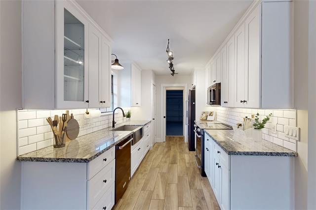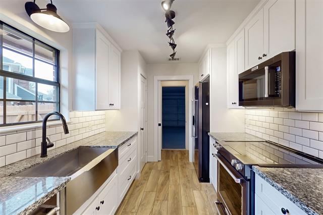 Inside, the home features durable wood-look tile flooring, offering both style and easy maintenance. The kitchen is a standout with granite countertops, shaker-style cabinetry, a large stainless steel sink, and a full suite of black stainless KitchenAid appliances. Thoughtful upgrades continue with custom built-ins in the back bedroom, adding both functionality and character.
