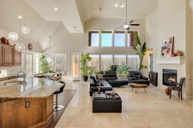 Enjoy soaring ceilings and a vaulted family room with a cozy fireplace, a chef-inspired kitchen with custom cabinetry, granite slab counters, gas cooktop, pantry,