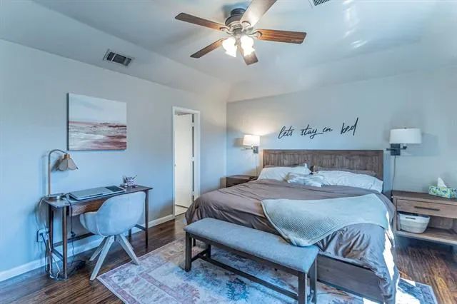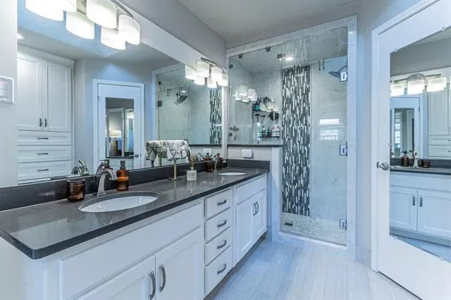 The spacious primary suite features a private en suite bath with a double vanity, ample storage, and separation from the secondary bedrooms for added privacy.