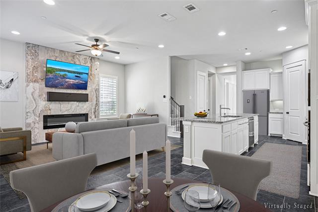 Beautifully appointed residence in Hometown Canal District that blends traditional and transitional elements. Great corner location for optimal natural light. Plantation shutters throughout, recent designer tile on first floor, gorgeous lighting, and new plush carpeting on second level. 2025 roof and 2022 dishwasher. Front-facing study and formal dining at entry lead to the heart of the home. The expansive living area has a striking floor-to-ceiling marble-effect wall with a linear fireplace. It opens to the kitchen with gas range and large center island. Next to the breakfast room is a generous flex space ideal for second work area or hobby niche. Upstairs, there is a spacious primary suite and two additional bedrooms with walk-in closets. Great storage throughout. EV charger remains in the rear-facing two-car garage. HOA includes roof, landscape, lawn & irrigation maintenance plus exterior building care. As a homeowner, your typical to-do list just eased! Choose this opportunity for a vibrant lifestyle location. Across the street is highly rated Walker Creek Elementary. Walking distance to Birdville HS and Nytex Sports Centre. Explore Hometown’s strolling paths with picturesque pond views & parks. Enjoy shopping, dining, and everyday essentials, only minutes from your doorstep. 8765 Bridge Street checks all the boxes, including proximity to DFW Airport & easy access commuter routes. Welcome Home!