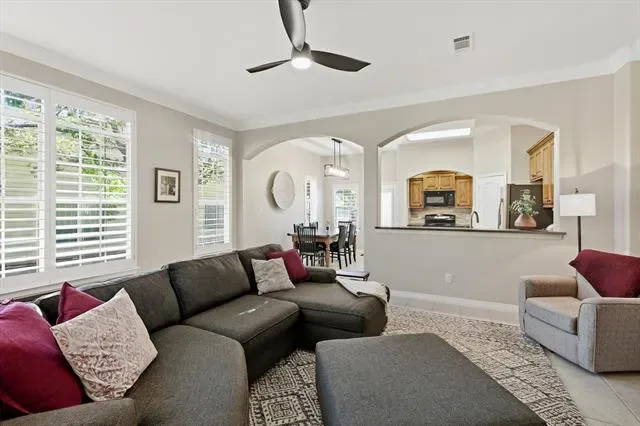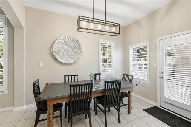Bathed in natural light, the open-concept main level features high ceilings, elegant plantation shutters, and rich finishes throughout. The inviting living room flows seamlessly into the dining area and a well-appointed kitchen complete with ample cabinetry, a breakfast bar, and direct access to a private patio—perfect for morning coffee or evening relaxation.