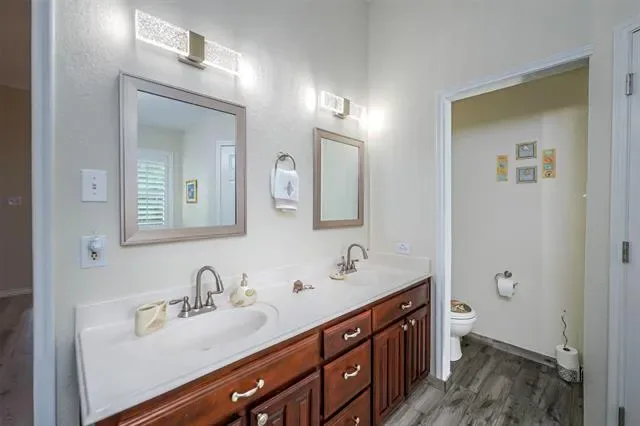 The private primary suite serves as a relaxing retreat, complete with a beautifully updated bathroom featuring a refreshed shower and tub surround, updated fixtures and lighting, dual sinks, a garden tub, and separate his-and-hers walk-in closets.