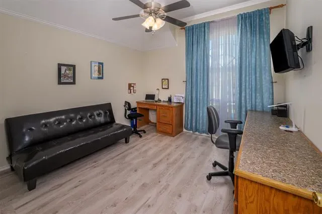 An oversized utility room adds convenience with extra space for a freezer. Step outside to enjoy covered patios in both the front and backyard—ideal for relaxing or hosting guests. The backyard also includes a 12×8 shed workshop equipped with electricity and a workbench.