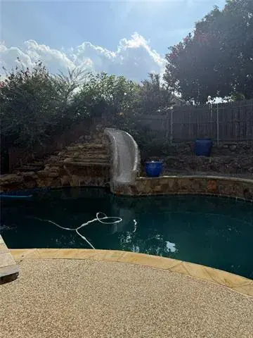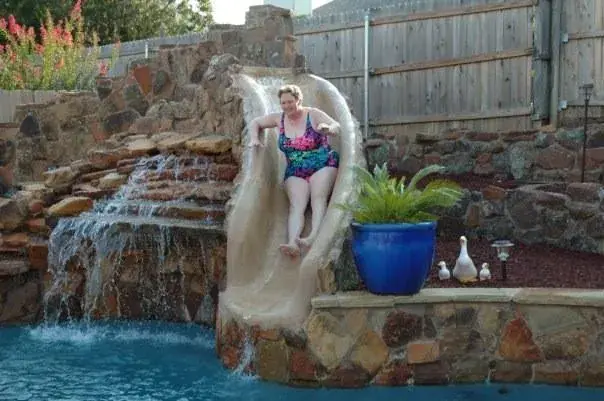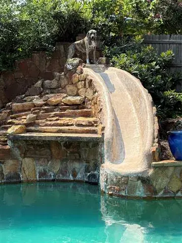4 bed 2 bath 3 car (665 sq ft) garage. 30K plus gal salt water heated pool and attached spa boasts 3 custom rock water features. Rock steps up to concrete slide. waterfall, rock grotto with bench. Beach entry.