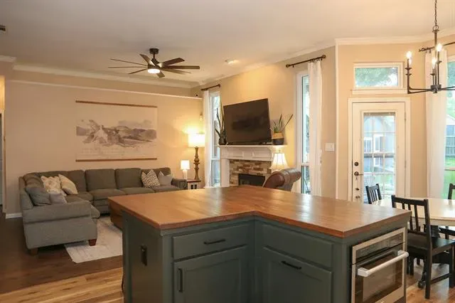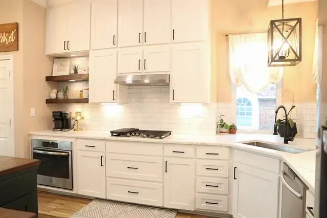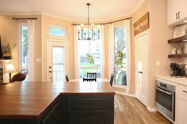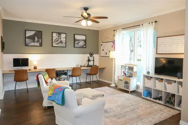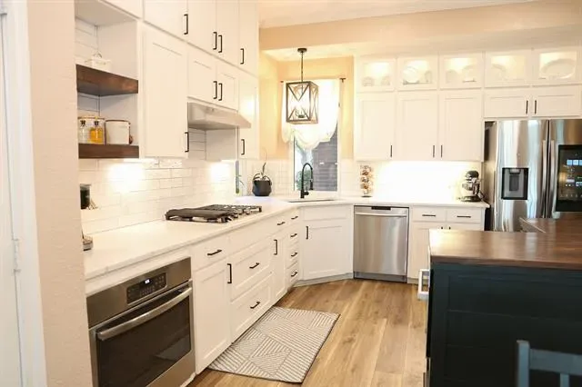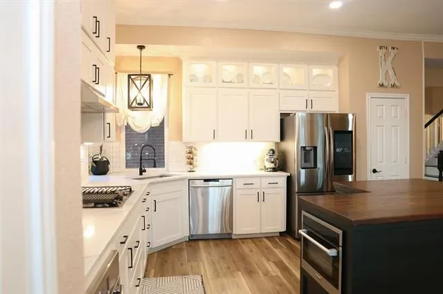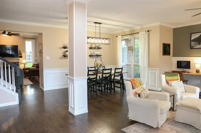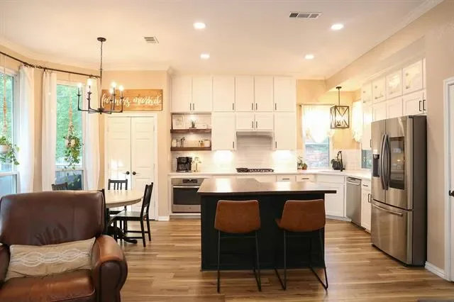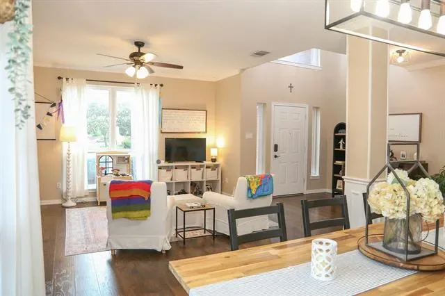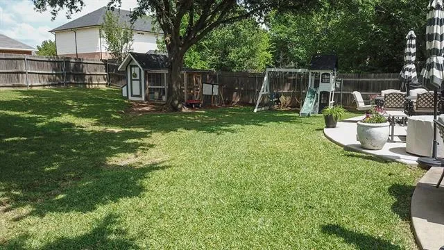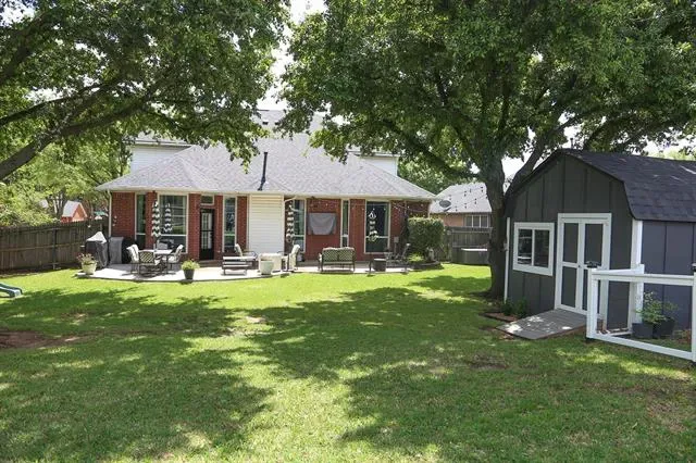 This beautifully maintained home in the heart of NRH sits on nearly a quarter-acre lot, conveniently located near elementary, middle, and high schools, as well as parks, walking trails, fishing pond, and has no HOA. Large windows fill the home with natural light, highlighting the recently renovated kitchen at the center of the layout. The split-level design features generous sized 4 bedrooms and 2.5 baths, offering both comfort and privacy. A dedicated movie room, children’s study, and formal dining room add to the spacious and functional interior with a custom built in dog kennel under the stairs. Step outside to a backyard retreat featuring beautiful, mature shade trees, a well-established garden, and an open back porch, perfect for relaxing or entertaining. With plenty of space for outdoor activities, this yard offers both comfort and versatility. Backyard also features a 16 x 16 shed. Whole house water softener system, new roof 2025, updated kitchen 2024, windows replaced throughout the home 2022 (with transferable warranty) Seller is offering a $5,000 flooring allowance. Washer and Dryer will convey with property. Chicken coop (and chickens if buyer wants them) and play set will also convey.