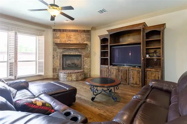 This beautiful custom home offers 5 spacious bedrooms, 4 baths, and stunning hand-scraped wood flooring throughout. The gourmet kitchen is a chef’s dream with granite countertops, a gas cooktop, stainless steel appliances, NEW Double oven, NEW Microwave, NEW dishwasher, NEW wine refrigerator, NEW Roof and elegant custom-built ins. The first-floor master suite features a separate tub and shower, double vanities, and a walk-in closet, while a private mother-in-law suite adds convenience and flexibility. Upstairs includes a game room, media room, three additional bedrooms, and two full baths—perfect for family living and entertaining. Step outside to a backyard oasis with a sparkling pool that backs up to a serene greenbelt, ideal for gatherings with family and friends. A beautifully detailed office and a custom wine cellar provide the perfect balance of work and relaxation. This move-in-ready home is truly a must-see!