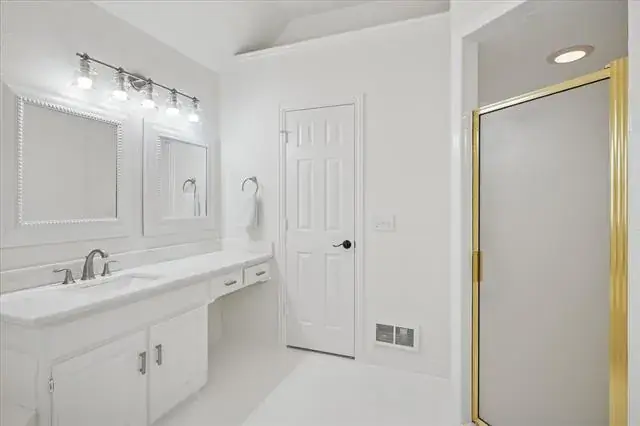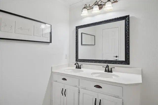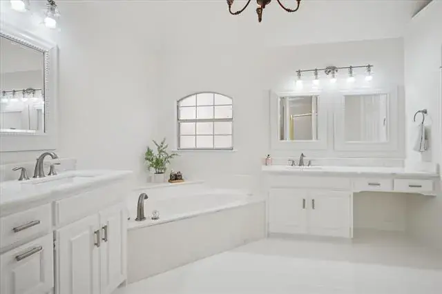 The spacious primary bedroom has room for a seating area and features a beautiful updated primary bathroom with separate vanities, updated marble countertops, modern lighting, a separate shower, jetted tub, and a large walk-in closet. A conveniently located half bath is also downstairs.