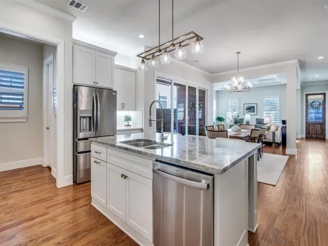 The stunning chef’s kitchen is the centerpiece of the home, featuring 5-burner gas cooking, custom cabinetry, a generous granite island with bar seating, a separate butler’s pantry w additional cabinetry and drawers, a dry bar, and a full walk-in pantry—perfect for effortless entertaining and daily living alike.