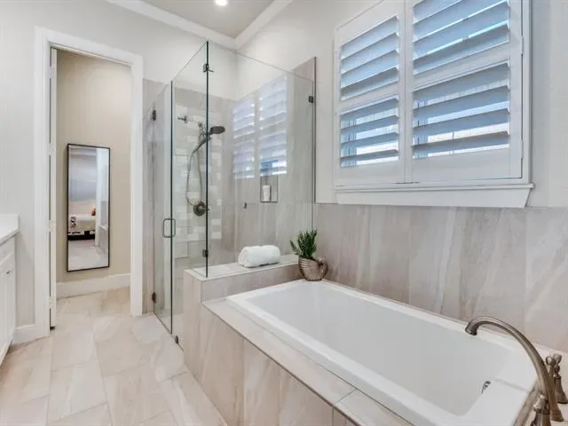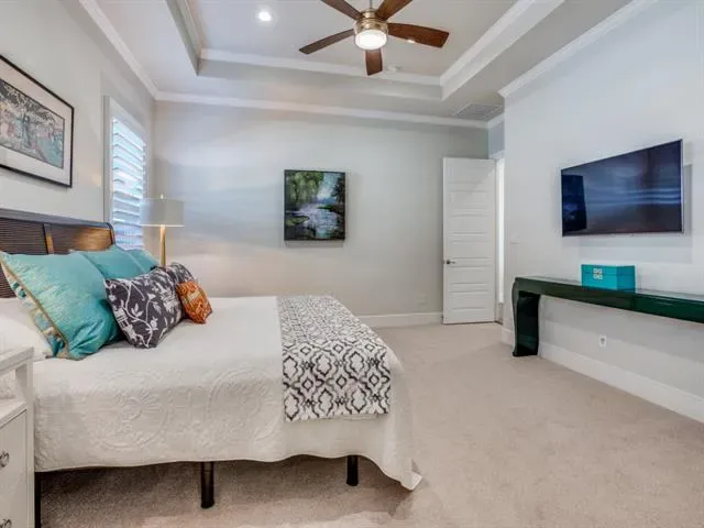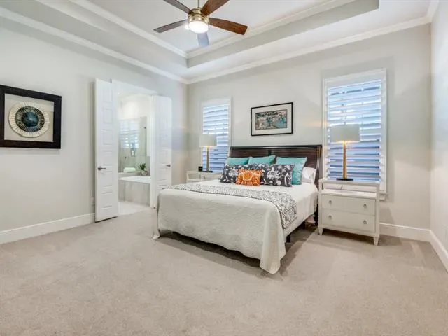 The serene primary suite offers luxury carpeting, a tray ceiling, and a spa-inspired ensuite bath w soaking tub, separate shower, dual vanities, + a custom walk-in closet w built-ins. Two additional bedrooms share a spacious hall bath, offering comfort and flexibility for family or guests.