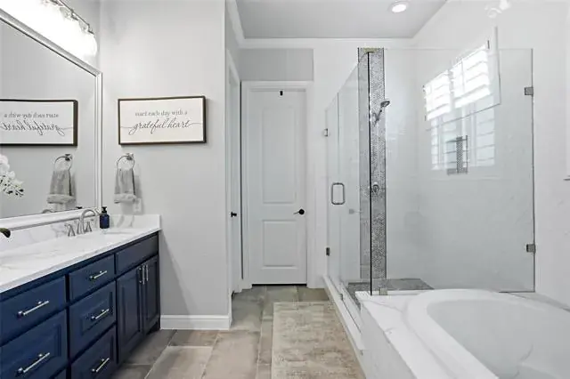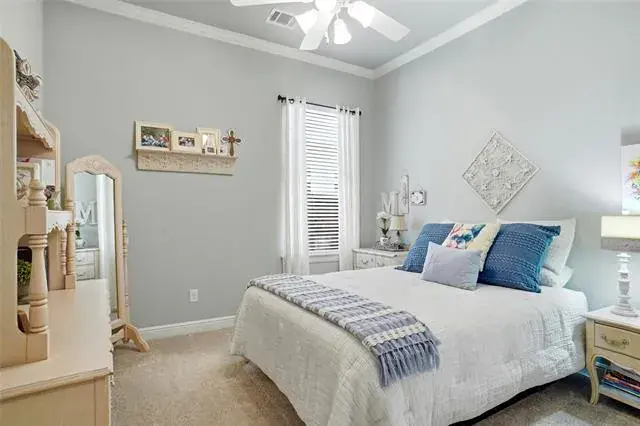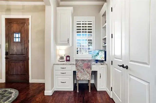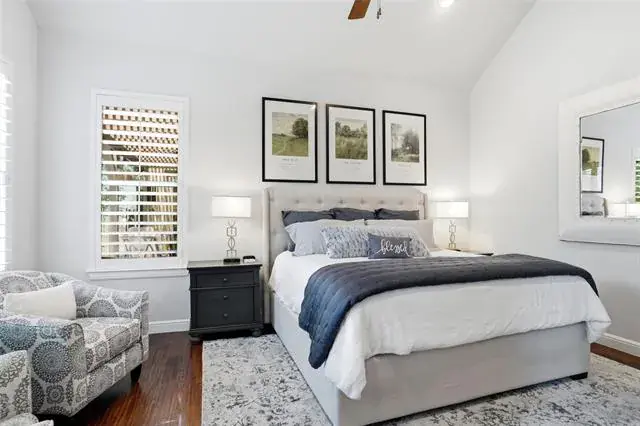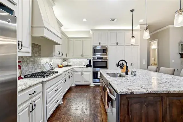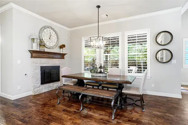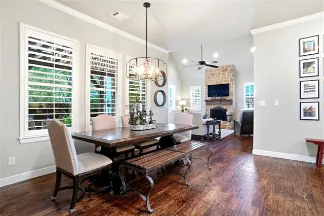 Discover the charm and sophistication in this stunning custom home built by Thomas-Payton builders. Situated in the highly sought after Hometown subdivision, this 3 bedroom, 2 bath residence offers 2212 sq ft of thoughtfully designed living space. A charming front porch welcomes you where an open floor plan flows effortlessly between the living room, dining area and kitchen. The living room features a floor to ceiling stone fireplace with vaulted ceilings and accented with wood beams. The exquisite kitchen showcases premium finishes, five burner gas cooktop, double ovens and designer granite. A built in desk nook provides a convenient space for remote work or study. The spacious primary suite serves as a private retreat , complete with, vaulted ceiling, dual quartz vanities, jetted tub, oversized shower and large walk in closet. Step outside to enjoy the gorgeous patio, complete with covered pergola, extensive mature landscape and soothing fountain. Other upgrades include fresh interior paint, nailed down wood floors, extensive trim, roof replaced in Oct. 2025 and plantation shutters. This home is all brick and stone, one of the few in Hometown. Residents of Hometown enjoy an exceptional lifestyle with access to peaceful ponds and fountains, scenic walking and biking trails, lush parks, charming gazebos and unique art installations throughout the neighborhood.
