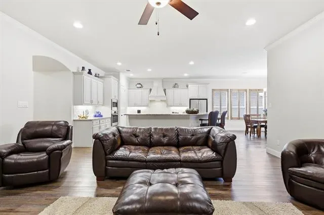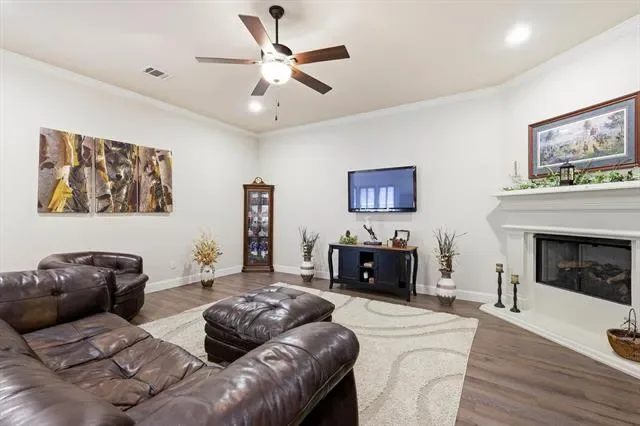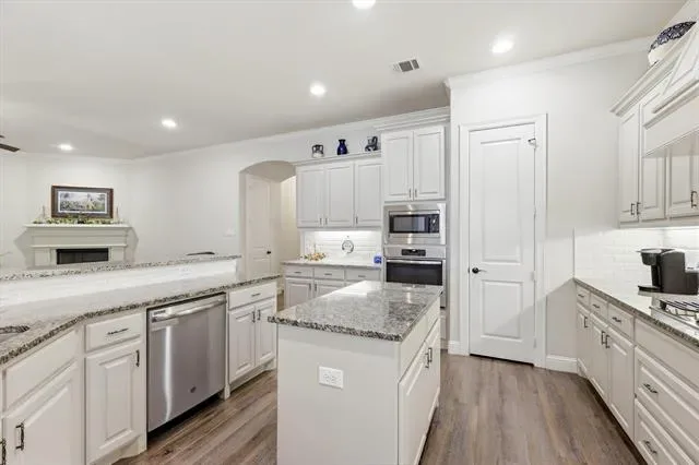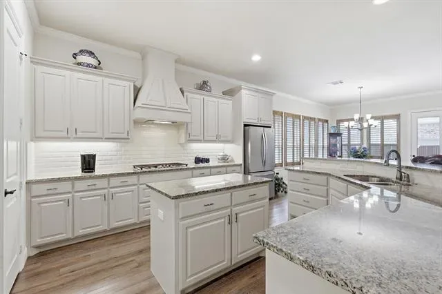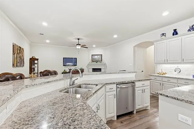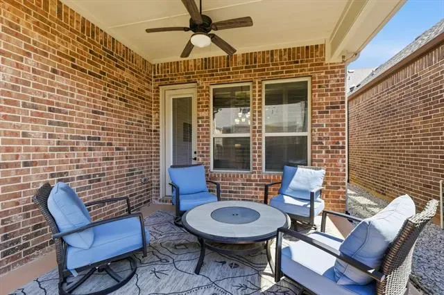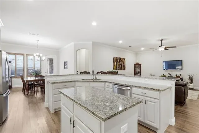 Beautifully maintained and like-new 2019 garden home in desirable North Richland Hills, offering low-maintenance living with stylish upgrades and soaring ceilings throughout. The heart of the home is the expansive chef’s kitchen, featuring granite countertops, a large island, gas cooktop, stainless steel appliances, walk-in pantry, and an abundance of cabinetry and counter space – perfect for both everyday living and entertaining. The kitchen flows seamlessly into the spacious living area with wall mounted TV that conveys with the home and a cozy gas fireplace, creating a bright and inviting open-concept layout.