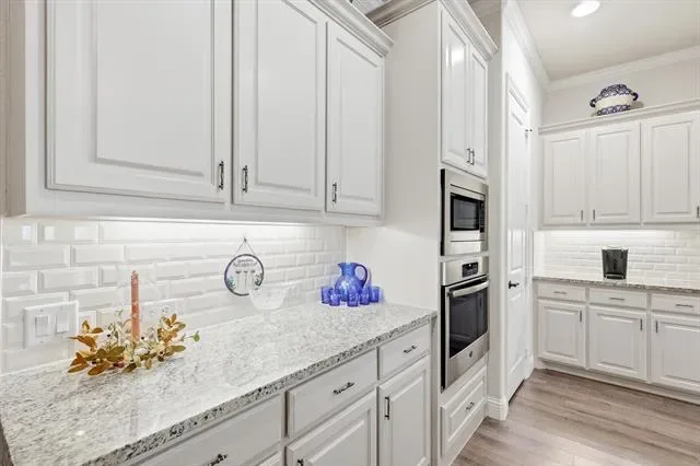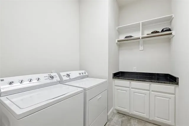 The laundry room is thoughtfully designed with built-in cabinets and a workspace, adding convenience and functionality.