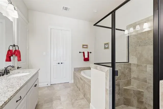 The private primary suite offers a relaxing retreat with a luxurious ensuite bath featuring dual sinks, a soaking tub, oversized separate shower, and a generous walk-in closet.
