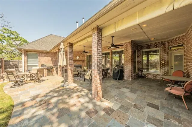 Designed for both comfort and efficiency, the home includes foam insulation and a Generac whole-home generator, providing energy savings and peace of mind year-round. Step outside to your private outdoor retreat featuring a covered patio with a built-in DHS grill, fireplace, and ample seating space—perfect for year-round entertaining. The beautifully landscaped yard backs to a peaceful greenspace, enhancing both privacy and natural beauty. Located within walking distance to Bicentennial Park, positioned just across the street from the side of the home, this property offers a rare combination of convenience and natural surroundings. Additional luxury features include an integrated surround sound system with a dedicated media closet, a wet bar with its own ice maker, and a TV built directly into the primary bathroom mirror—creating a true resort-style experience at home.