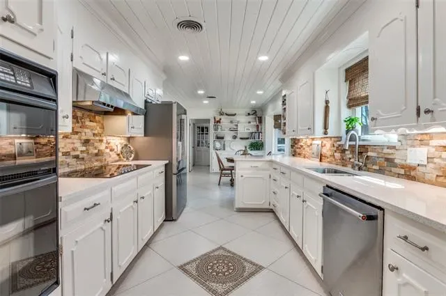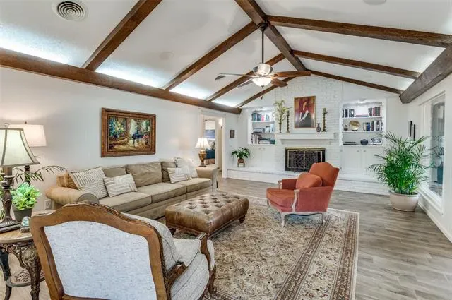 Arlington, Texas offers an exceptional home in the Township of Pantego. Set along a picturesque, tree-lined street, this extensively renovated residence blends timeless architecture with sophisticated modern upgrades. From the moment you arrive, the home’s striking curb appeal and refined details set the tone for what awaits inside. A light-filled, flowing floor plan enhanced by crown molding connects the main living and dining areas with effortless elegance. The grand family room features soaring exposed beams and a wood-burning fireplace, creating a dramatic yet inviting focal point. An expansive media room provides versatility as a private lounge, executive study, or entertainment retreat. The chef-inspired kitchen is both warm and refined, showcasing a wood plank ceiling, custom-style cabinetry, quartz tops, designer backsplash, and layered recessed and under-cabinet lighting. A charming breakfast nook with bay windows and built-ins for space. The sunroom serves as a stunning sanctuary with skylights, walls of windows, wet bar, and travertine flooring. The primary suite offers a serene escape with private sunroom access and a spa-caliber bath featuring a frameless glass walk-in shower with dual shower heads, dual vanities with soft-close drawers, and an oversized walk-in closet. Two additional bedrooms and a beautifully updated secondary bath ensure comfort for family and guests.