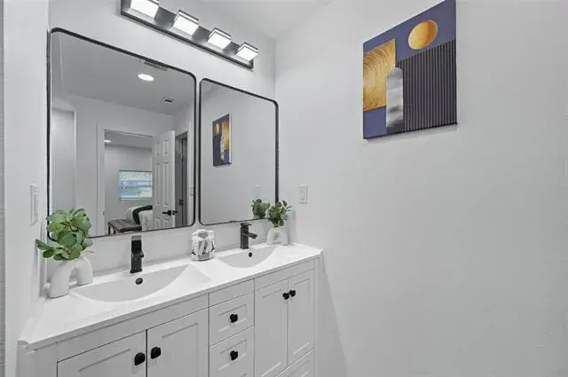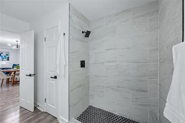 The guest bedrooms are generously sized and share a spacious full bath complete with a quartz vanity, modern shower, and convenient linen closet. The primary suite offers a relaxing retreat with space for a sitting area, and a luxurious en suite bath featuring a dual vanity, gorgeous shower, and a walk-in closet with built-in storage.