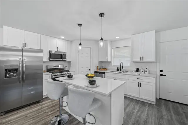 Inside, no detail has been overlooked. Updates include brand-new windows, electrical panel, an upgraded HVAC system with new ducting, new flooring and doors, and fully renovated kitchen and bathrooms. The kitchen is a chef’s dream with quartz countertops, a large island, new cabinetry, full size pantry, and stainless steel appliances—including a gas range and double-door refrigerator.