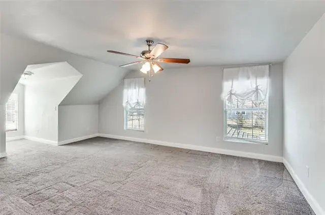 The kitchen connects seamlessly to the main living space and features ample cabinetry, a tile backsplash, stone-look countertops, and a large center island suitable for everyday use and entertaining. Bedrooms are generously proportioned with ceiling fans and closet space, including an expansive upstairs area that offers flexibility for a primary suite, office, or additional living area.