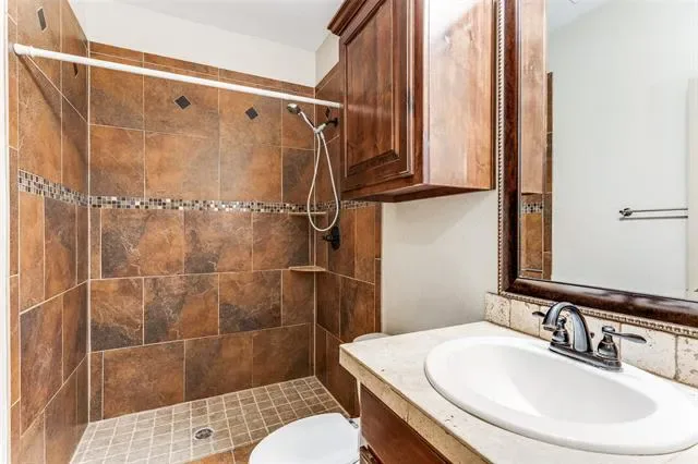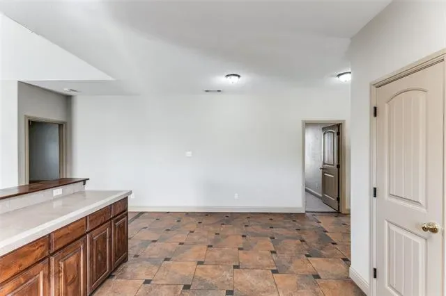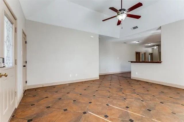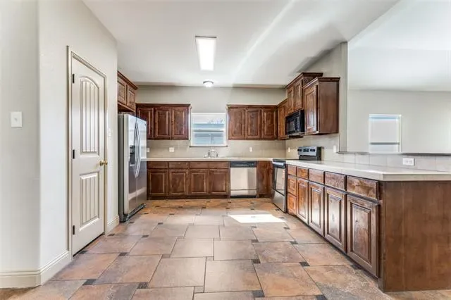 Well maintained house is ready for new owner. Property sits on a hill and is in a hilly location–something unique in the DFW area! From the front door you are welcomed into an open living room with lots of natural light, then your eyes are immediately drawn to a beautiful tile design on the floor where one is beckoned to stay and enjoy the warmth of the home. The kitchen sits just behind the counter, displaying lots of storage space, a brand new stove & oven range and spacious pantry. This house comes with a refrigerator, a washer and a dryer ready for the new homeowner first day moving in.