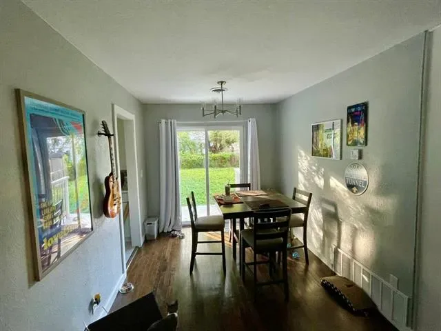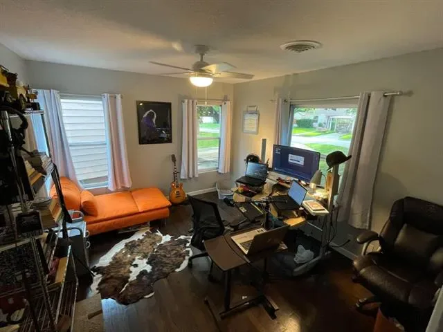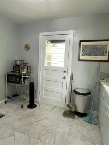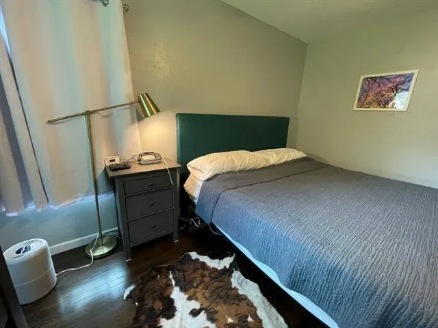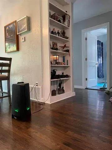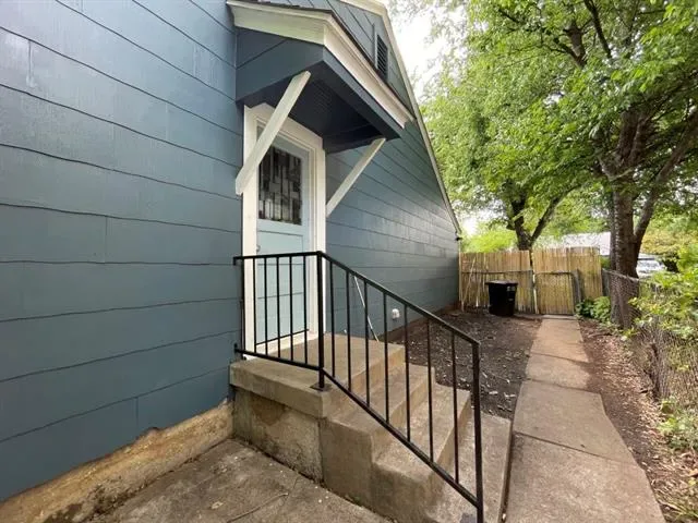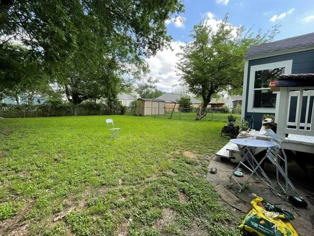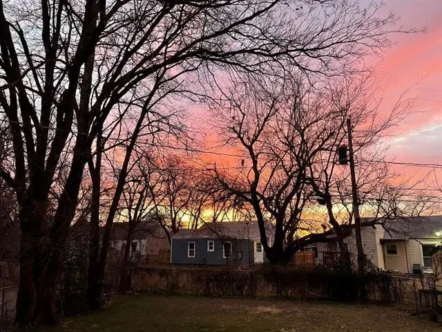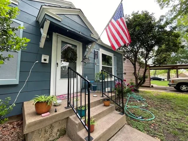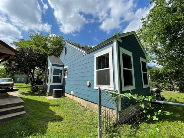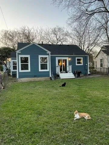 Two bedroom, one bathroom home built in 1943 with 850 square feet of living space on a 6185 square foot lot. Renovated in 2024 with restored original hardwood floors, interior and exterior paint 2024, vinyl double pane windows installed 2024, roof replaced 2024, PEX water lines installed 2024, and updated kitchen and bathroom with quartz countertops. Interior features include built in features, decorative lighting, hardwood and tile flooring, gas heating, and electric cooling. Appliances include gas oven range and gas water heater. Refrigerator, washer, dryer, and rolling kitchen island purchased 2024 are included. Laundry area is in the garage. Exterior features include one car garage, driveway parking, rear porch, chain link fencing, and mature trees. Located in Castleberry ISD about 4 miles west of downtown Fort Worth near Jacksboro Highway and River Oaks Boulevard.