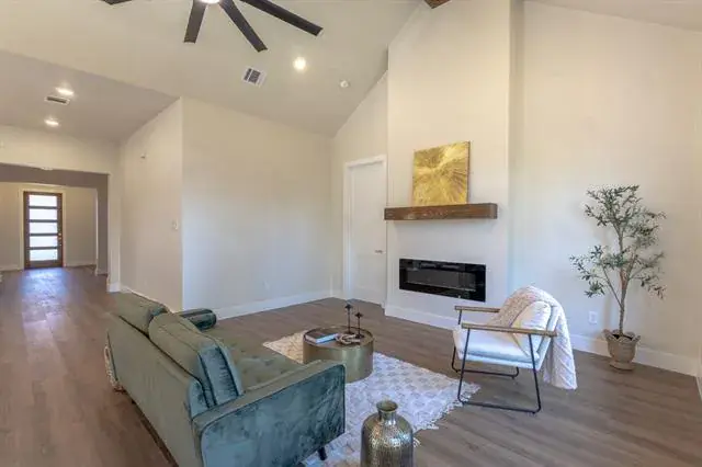 New Construction!! Welcome to this stunning single-story home blends timeless curb appeal with fresh, modern finishes. The exterior showcases warm brick and stone accents, and inviting gable details that create a standout presence on the street. A wide driveway and welcoming front entry set the tone for the thoughtful design found inside. Step into an open-concept layout filled with natural light, where soaring ceilings and elegant finishes elevate everyday living. The gourmet kitchen is the centerpiece of the home, featuring custom white cabinetry, a large island with seating, quartz countertops, pendant lighting, and a stylish marble look backsplash. It flows seamlessly into the dining area and spacious living room, making it perfect for gatherings. The living area offers a clean, neutral palette with warm vinyl flooring, a modern ceiling fan, and generous space for relaxing or entertaining. Large windows brighten every corner, creating an airy and inviting environment. Master bedroom comes with his and hers private bathroom, walk in shower and a large walk in closet with tons of space to organize personal items. Tons of space in laundry room including a mudroom. With its thoughtful layout, quality craftsmanship, and modern farmhouse design, this home delivers comfort, style, and functionality ideal for anyone looking for a move in ready, picture perfect property.