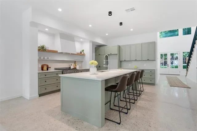 Inside, the open-concept floor plan showcases sunlit living, dining, and kitchen spaces that flow seamlessly together. Custom finishes, designer lighting, and warm wood accents enhance the refined farmhouse aesthetic. The gourmet kitchen is both functional and elegant, featuring quartz countertops, top-of-the-line appliances, abundant cabinetry, and a large center island perfect for gathering with family and friends.
