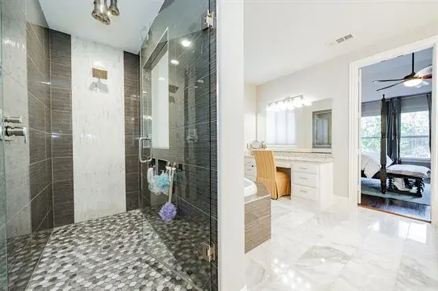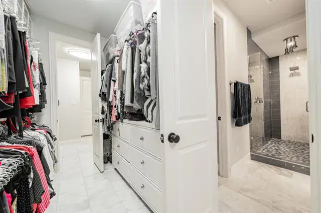 The main level includes a private study, elegant formal dining room, spacious living area, and a comfortable secondary guest suite. The secluded primary suite is a true retreat, offering an updated spa-inspired ensuite with dual sinks, a garden tub, and a luxurious oversized walk-in shower equipped with multiple rain shower heads. The expansive walk-in closet provides abundant storage and conveniently connects to the laundry room.