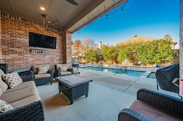 Outdoor living is equally impressive. Enjoy the beautifully designed backyard featuring a covered patio with a TV mount and overhead fan, custom-designed pool and spa elevate the space, complete with a high-efficiency heater, integrated saltwater and chlorine system, stonework and a serene water feature. The seller is willing to negotiate some furniture. Located in the highly desirable Fairway Ranch community, residents enjoy exceptional amenities including a community pool, clubhouse, jogging trails, playgrounds, fishing ponds, and scenic greenbelts. All of this is situated within the award-winning. Please take a moment to explore the floor plans, 3D tour, and video provided.