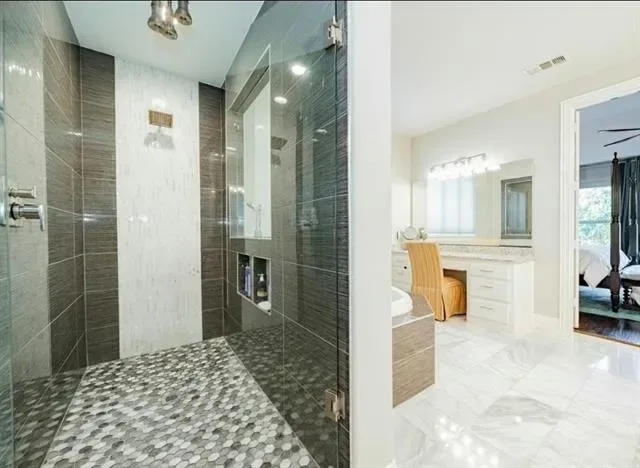The main level includes a private study, elegant formal dining room, spacious living area, and a comfortable secondary guest suite. The secluded primary suite is a true retreat, offering an updated spa-inspired ensuite with dual sinks, a garden tub, and a luxurious oversized walk-in shower equipped with multiple rain shower heads. The expansive walk-in closet provides abundant storage and conveniently connects to the laundry room.