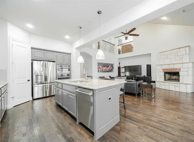 Step inside to find gorgeous hand-scraped hardwood floors flowing through the entry, study, living room, dining room, and kitchen. The gourmet kitchen is a chef’s dream, showcasing custom cabinetry, a large center island, and premium stainless-steel appliances. It opens seamlessly into a bright and inviting living room highlighted by a dramatic floor-to-ceiling stone fireplace.