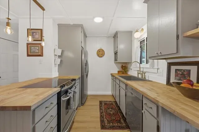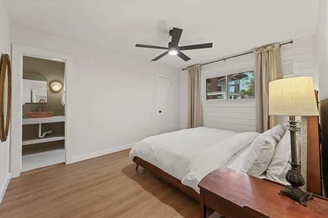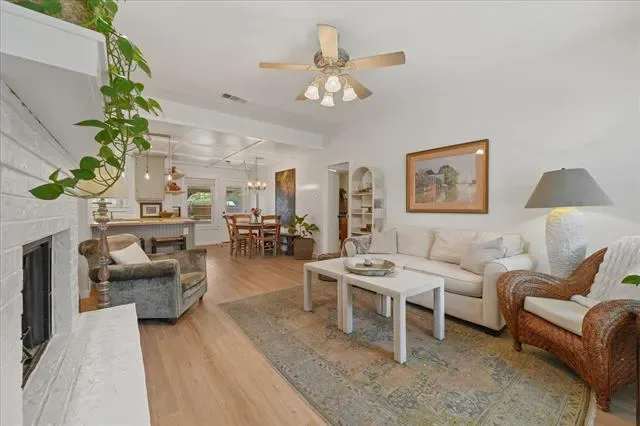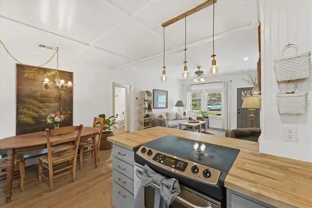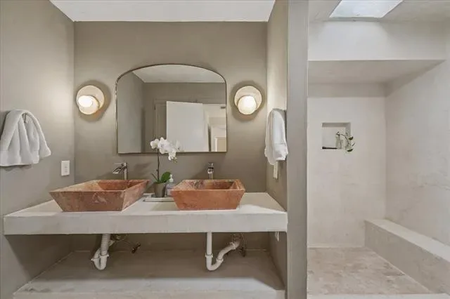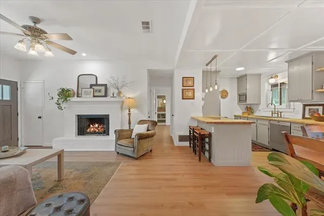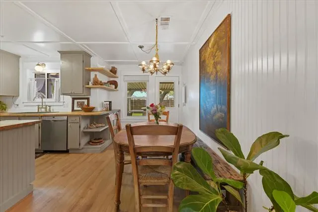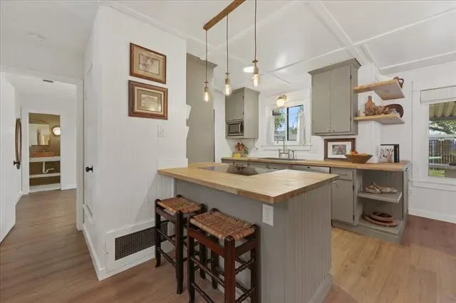 Inside, a bright, neutral interior balances warmth with modern restraint. The kitchen anchors the home with butcher block countertops, a custom island with cooktop, and updated cabinetry. The primary ensuite is where this home earns its stripes — terracotta vessel sinks, a custom concrete vanity, and a skylight-lit microcement walk-in shower that feels far more spa than subdivision. The split floorplan features a private primary retreat with secondary bedrooms on the opposite side of the open living space. Throughout the home, beadboard ceilings, elegant wainscoting, and shiplap accents create a cohesive, custom character that can''t be replicated with a renovation budget.