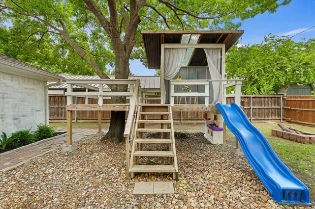 Out back, the oversized lot delivers a private retreat under mature trees. The covered patio with bistro lighting sets the tone for slow evenings, while the custom elevated treehouse — complete with slide and rock climbing wall — earns instant credibility with the younger crowd. Out front, professionally designed native-inspired landscaping with stone-bordered beds, turns heads before anyone steps inside.