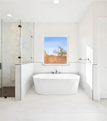 The primary suite offers a refined retreat with large picture windows and a spa-inspired bath complete with dual vanities, freestanding soaking tub, expansive walk-in shower, and dual closets. A secondary bedroom suite downstairs adds flexibility for guests or multigenerational living.