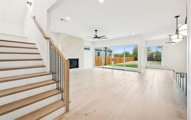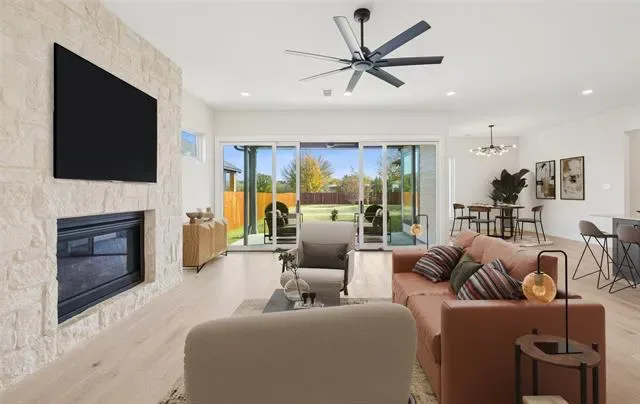 This 4-bedroom, 4.1-bath residence spans 3,504 square feet of thoughtfully designed living space with high-end finishes and seamless indoor-outdoor flow. Expansive Andersen Low-E windows flood the open-concept main level with natural light. The living area is anchored by a dramatic floor-to-ceiling stone fireplace and oversized sliding glass doors opening to a covered patio—ideal for entertaining.