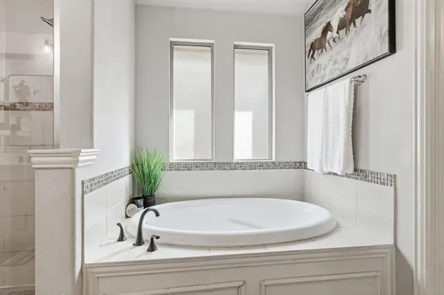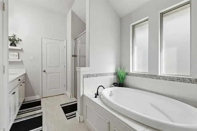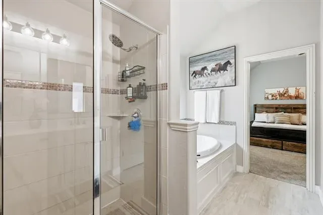 The private primary suite includes an ensuite bath with split shower-garden tub, dual sinks, and walk-in closet.