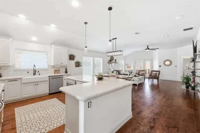 The open-concept living area showcases a beautiful kitchen, dining space, and family room anchored by a cozy gas fireplace. The kitchen is thoughtfully appointed with abundant counter space and storage, a huge walk-in pantry, stainless steel appliances, white cabinetry with glass-front accents, gas cooktop, farmhouse sink, and a large island that opens seamlessly to the living area.