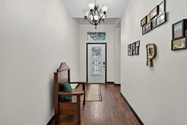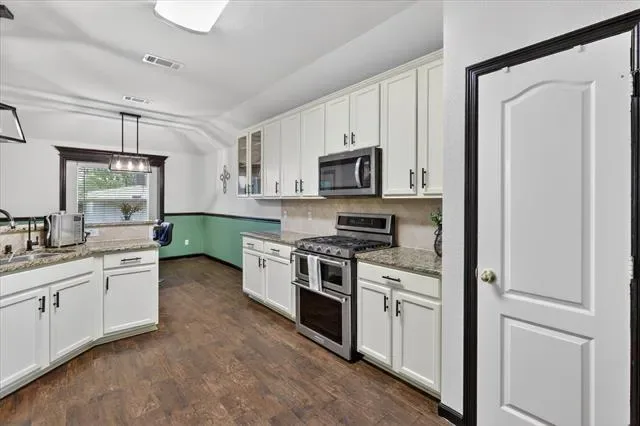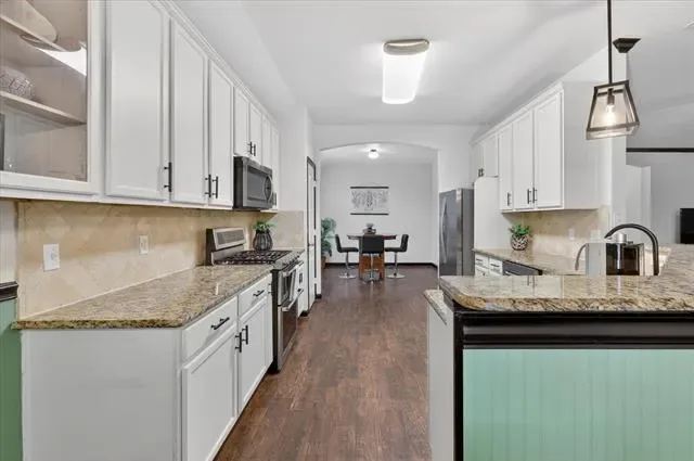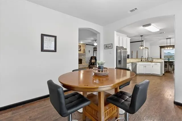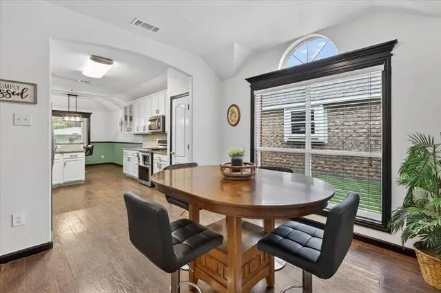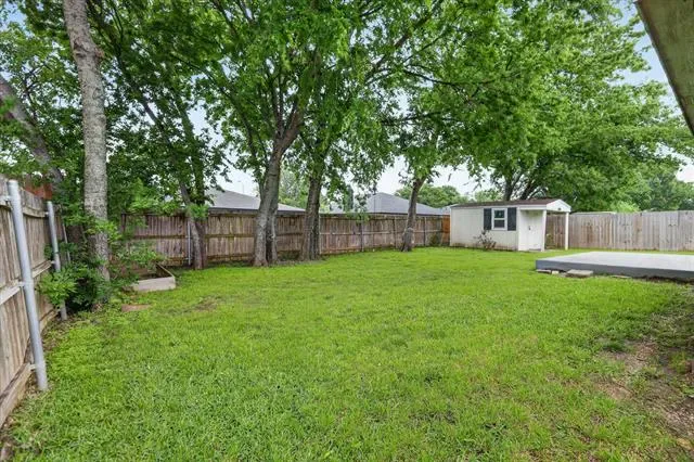 Welcome to this beautifully maintained single-story brick home nestled in an established, quiet neighborhood on the desirable west side of Saginaw, offering a rare blend of convenience and tranquility without the congestion of newer developments. Step inside to a spacious 6-ft wide foyer leading into an inviting open living area featuring rich wood flooring, a stunning stone gas fireplace, and a wall of windows that fills the space with natural light. The home has been refreshed with modern paint tones and updated kitchen cabinetry, creating a clean, move-in ready feel. The chef’s kitchen is equipped with stainless steel appliances, a 5-burner gas range, convection oven, pantry, and updated lighting and hardware. The private primary suite features a beautifully updated bathroom with a new double-sink vanity, garden tub, separate shower, and a generous walk-in closet. Additional highlights include a separate utility room, full yard sprinkler system, and a recently installed water heater. Major system upgrades in recent years include HVAC, ductwork, and insulation for added efficiency and peace of mind. Enjoy outdoor living with an extended 17-ft patio, large fenced backyard, and a 12×12 storage shed with electricity, perfect for hobbies or additional storage. Located in Eagle Mountain-Saginaw ISD and just minutes from Loop 820, this home offers easy access to shopping, dining, and entertainment without the traffic or train delays common in other areas. Community amenities include a pool, park, and walkable streets.