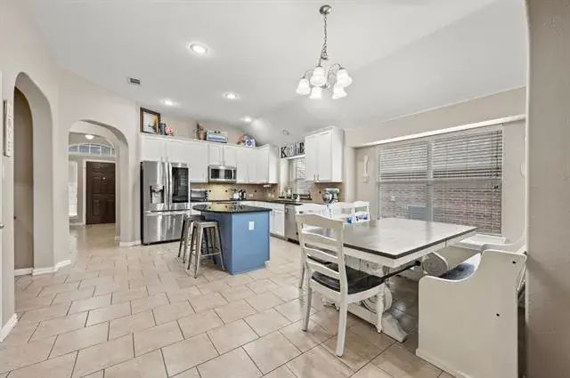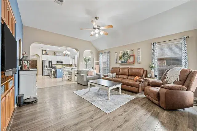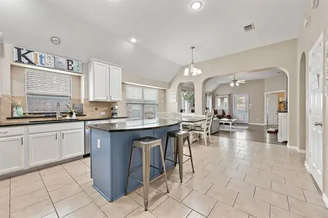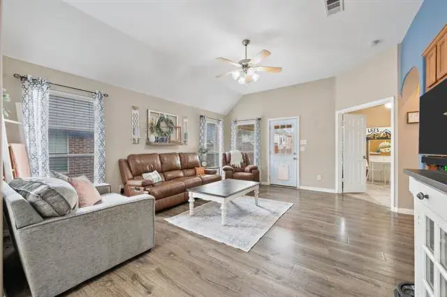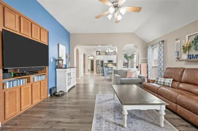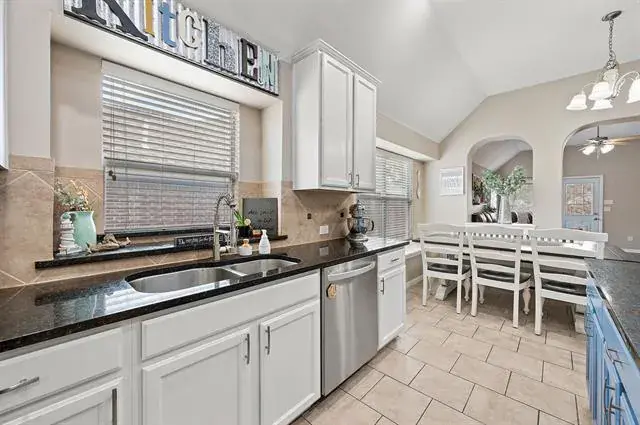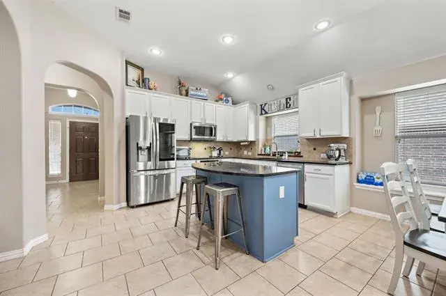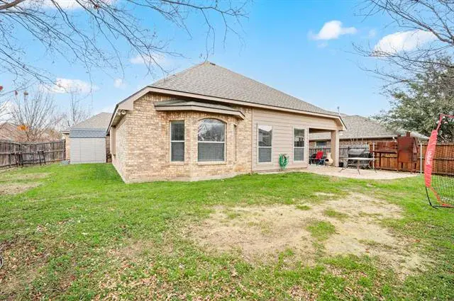 Spacious single-story home in the Creekwood community offering 3 bedrooms, a dedicated office, and a 3-car garage in Eagle Mountain–Saginaw ISD. This 3-bedroom, 2-bath home offers over 2,000 square feet with a functional, open layout and a dedicated office, ideal for remote work or flex space. The kitchen features granite countertops, a center island, pantry, built-in cabinetry, and flows seamlessly into the living and dining areas for easy everyday living and entertaining.The primary suite includes dual sinks, a garden tub, separate shower, and walk-in closet. Secondary bedrooms are generously sized. Flooring includes engineered wood, laminate, tile, and carpet throughout. Additional features include a 3-car garage, covered patio, sprinkler system, storage shed, and interior lot location. Creekwood residents enjoy access to a community pool, playground, sidewalks, and green spaces. Conveniently located near shopping, dining, and major commuting routes with quick access to I-35W and US-287. Survey available.