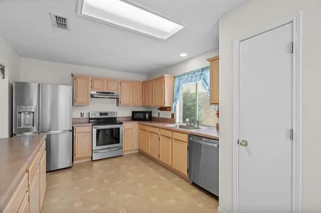 The spacious kitchen includes a breakfast bar, updated stainless steel appliances, and generous counter space—ideal for cooking, hosting, or casual family meals.