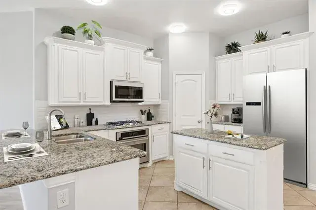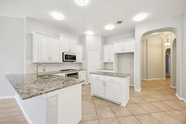 Chef-Ready Kitchen: Granite countertops, massive center island, gas cooktop, and tall custom cabinetry.