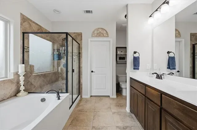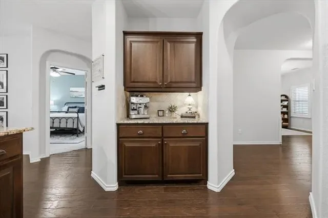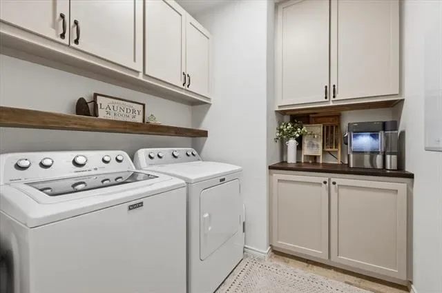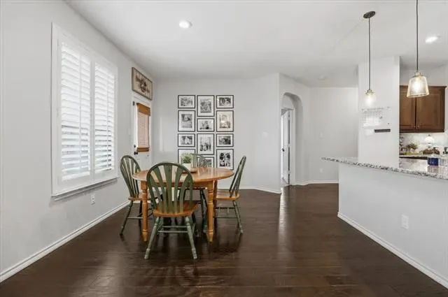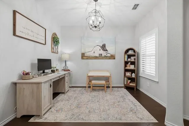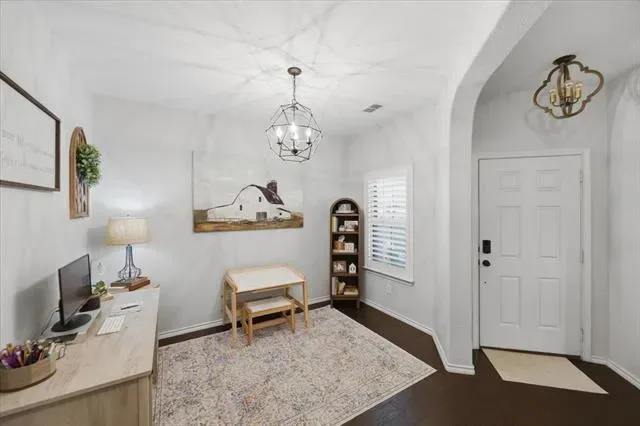 The versatile floorplan includes a dedicated dining room that can easily function as a second office or flex space. Split guest bedrooms are thoughtfully positioned away from the private primary suite, creating a comfortable retreat at the end of the day. The primary suite features dual sinks, a garden tub, separate shower, and a spacious walk-in closet. The laundry room has been upgraded with custom built-in cabinetry, adding both style and function.