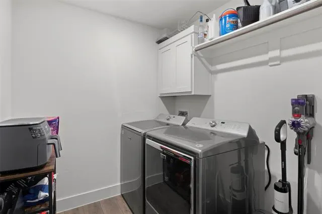 Inside, the living space is enhanced by a sleek, powered TV mount, delivering a clean, modern aesthetic. The kitchen has been elevated with upgraded appliances, including a dishwasher, designer range hood, and a double oven dual fuel gas range—perfect for both everyday living and culinary enthusiasts. A natural gas tankless water heater provides energy efficiency and endless hot water, adding both convenience and long-term value.