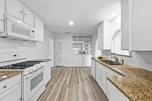 Well designed kitchen provides extended granite countertops, subway tile backsplash, abundant white cabinetry, and open pass-through to the living area. Designed for both everyday efficiency and effortless entertaining.