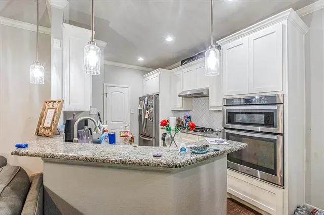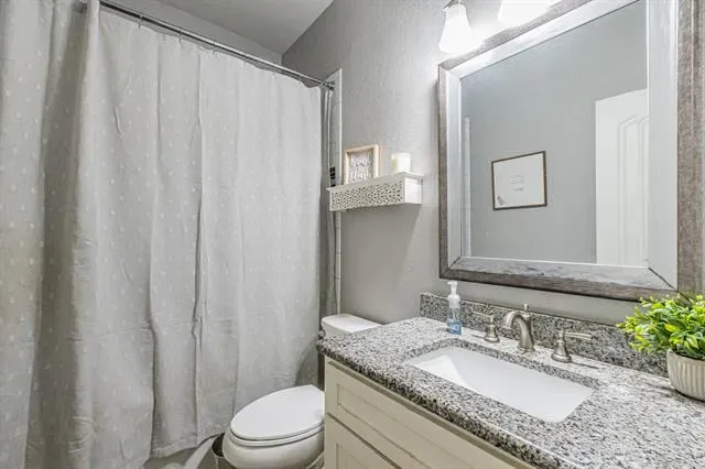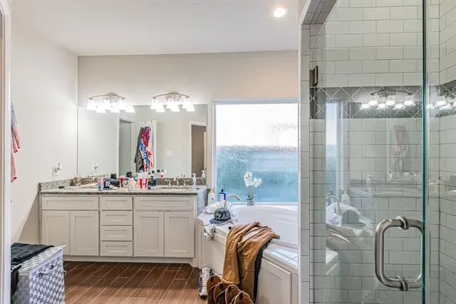 Step into effortless living with this beautifully designed single-story home. From the moment you arrive, the inviting curb appeal and front two-car garage set the tone for what awaits inside. A grand entry welcomes you with stunning herringbone-patterned wood-look tile floors and soft, neutral tones that create a warm and sophisticated first impression. The thoughtfully designed open-concept floor plan flows seamlessly, ideal for both everyday living and entertaining. At the heart of the home, the expansive living room features a cozy gas fireplace and abundant natural light, creating an inviting space to gather and relax. Just beyond, the bright breakfast nook offers the perfect spot to enjoy your morning coffee while overlooking the backyard. The kitchen is truly a showstopper, designed for both beauty and function, with a wraparound breakfast bar, gleaming granite countertops, pristine white shaker-style cabinetry, and stainless steel appliances including a gas cooktop. Whether hosting guests or preparing a quiet meal at home, this space delivers. All bedrooms are generously sized and feature ceiling fans and durable, stylish flooring, no carpet anywhere for easy maintenance and modern appeal. The guest bathroom is tastefully appointed with granite countertops, a garden tub, and an elegant framed mirror. Retreat to the spacious primary suite, complete with room for a sitting area. The en-suite bath offers a spa-like experience with dual sinks, a soaking garden tub, separate shower, and a large walk-in closet. Step outside to a nicely sized backyard designed for enjoyment, featuring a covered patio perfect for relaxing evenings or weekend gatherings, and plenty of space for kids and pets to play.