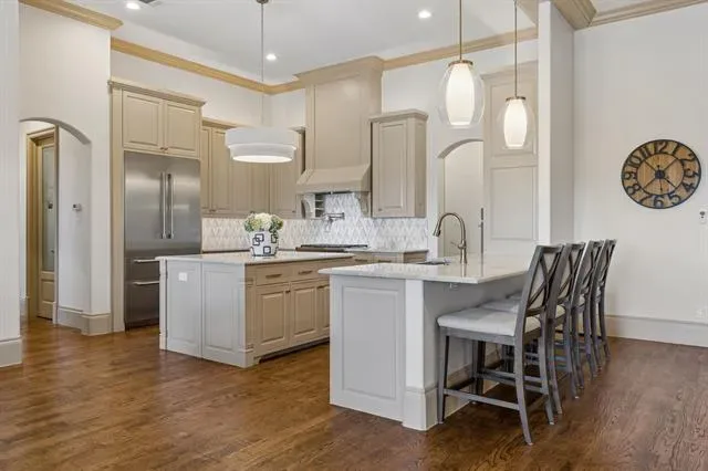 Stunning single story home in the sought after Camden Park addition of Southlake, situated on a spacious 0.381 acre lot. From the moment you arrive, you’re welcomed by an impressive iron front door, soaring coffered ceilings, and elegant arched doorways that create a refined yet inviting atmosphere. Designed for effortless entertaining, this home offers exceptional spaces for hosting and gathering, including a butler’s pantry, wine room, and a versatile fully equipped media room that can easily function as a game room. The chef’s kitchen is a true showpiece, featuring quartzite countertops, commercial-grade appliances, built-in refrigerator, gas cooktop with pot filler, double ovens, and an expansive walk-in pantry.