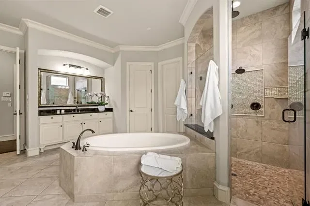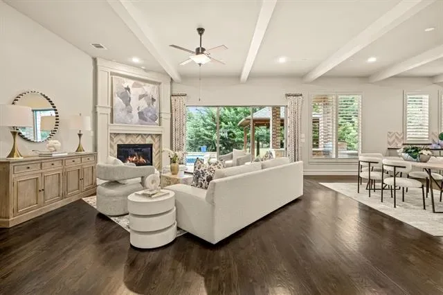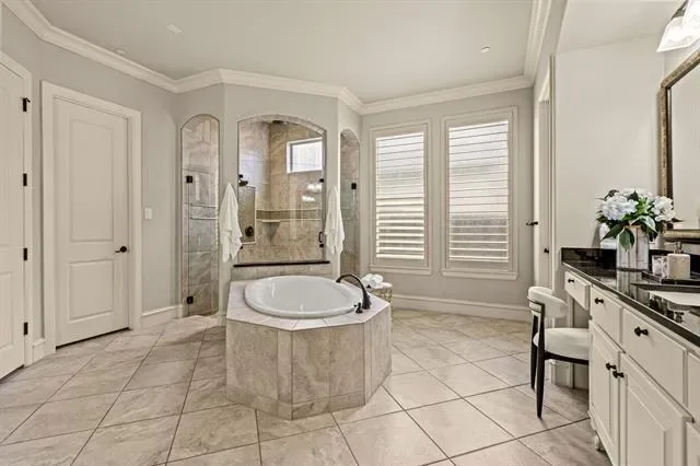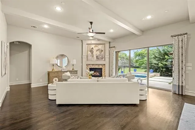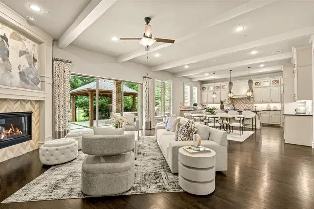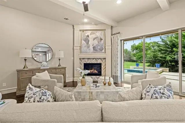 The inviting living room offers a cozy fireplace and picturesque views of the backyard pool. The primary suite provides a private retreat with a spa-like bath featuring dual vanities, a soaking tub, and a separate walk-in shower.