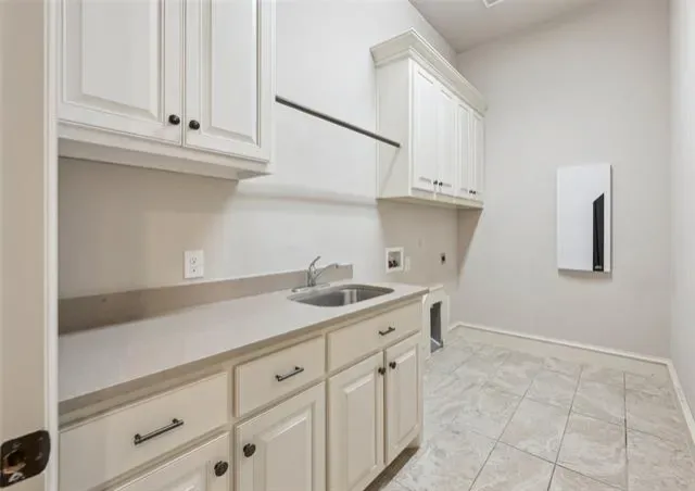 The chef’s kitchen is designed to impress, boasting stainless steel appliances, a gas cooktop, double oven, a spacious island with bar seating, and a stylish coffee bar complete with a wine cooler. A well-appointed laundry room with cabinets and a sink adds everyday convenience.