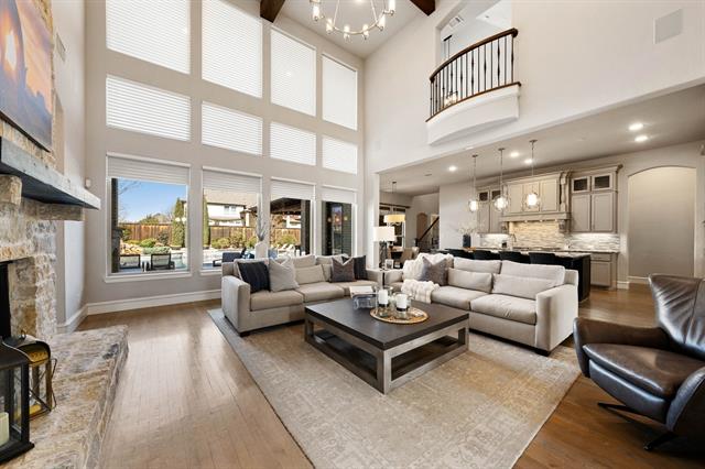 We’re obsessed. Located in exclusive Carillon, minutes from Southlake Town Square, this incredible estate offers a resort lifestyle without ever leaving home. Impressive from first glance, stunning throughout. Two-story grand entrance, sweeping staircase, Juliet balconies' expansive great room, two-story fireplace' wall of windows overlooking the pool' incredible backyard paradise' huge entertaining space' and the list goes on. With every detail perfectly blended together, sitting on an oversized lot, 908 Rhone is a rare find. Everyone will easily end up around the huge kitchen island, complemented by custom cabinets, vent hood, 6-burner gas cooktop &' griddle, high-end countertops &' backsplash, built-in Sub-Zero, SS appliances, breakfast area, and large walk-in pantry. An adjacent butler’s pantry to the formal dining makes entertaining a breeze. The primary suite will sweep you off your feet with a barrel ceiling and curved seating area. Its ensuite invites you to relax and unwind with two vanities, triple-window walkthru double shower, soaking tub, and large custom closet with built-ins and clothing cabinets. The real treat is outside, where you’ll find an oasis filled with the sound of the natural rock waterfall, spilling into a beautiful pool and spa. The expansive concrete deck, a large covered patio area with built-in grill, gas griddle, and space for a Green-Egg + adjacent two-story seating area + large outdoor fireplace, perfect for cozy afternoon game watching. Elevated rotunda-style office up front + secluded guest suite &' ensuite on the first floor, along with large media room with tiered theater seating, and home gym-flex space with sliders out to the covered patio. Three good-sized bedrooms + three ensuite baths upstairs, surrounding the gameroom + play area + bev bar + powder bath, giving you room for multiple game tables, entertainment, and more game watching. Two separate entrances from the 4-car garage + storage for bikes, equipment, and workbenches.